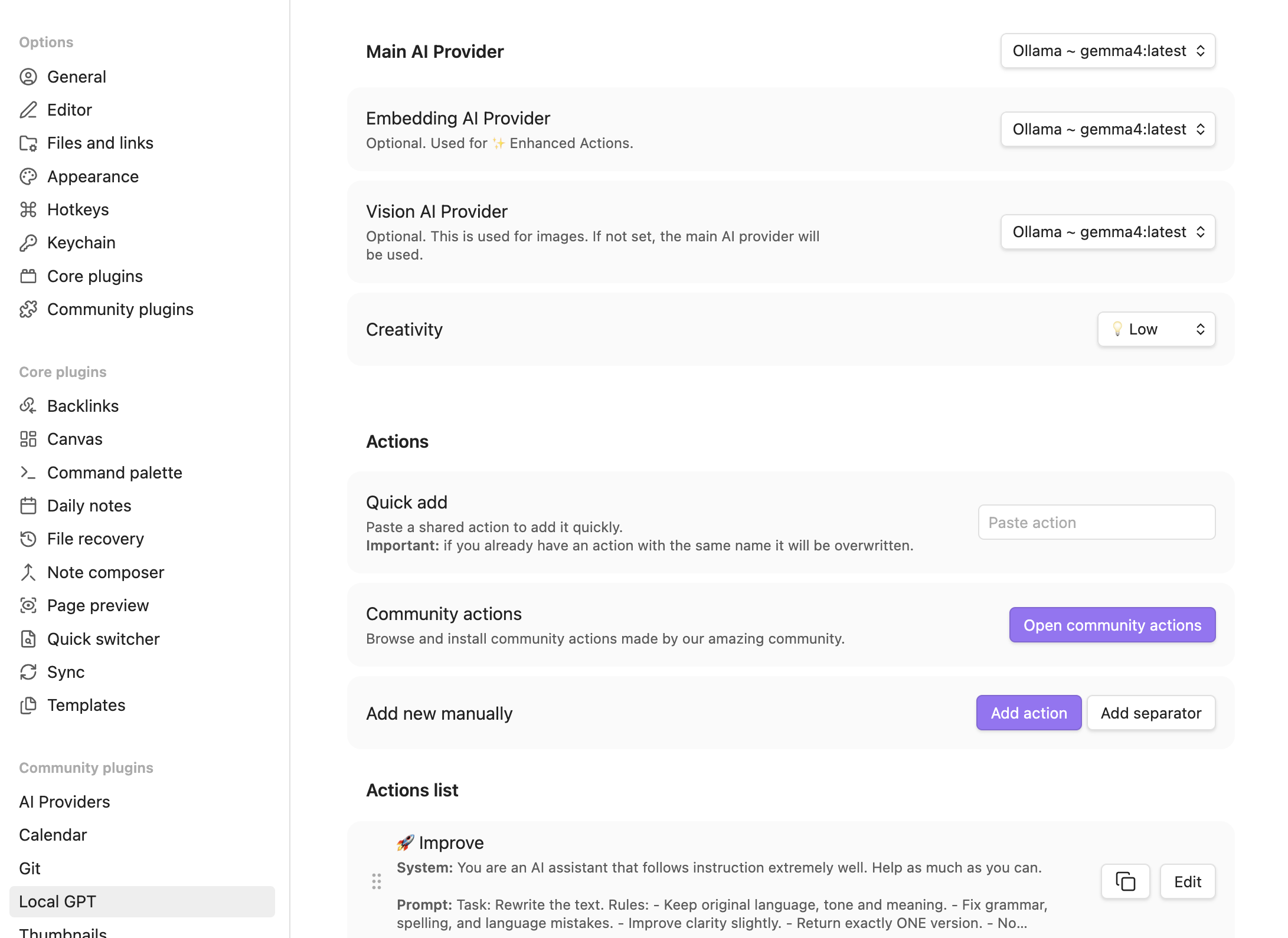 - For “Local GPT: Action Palette”, click on ”+” and press your desired key combination (e.g., ⌘ + J).